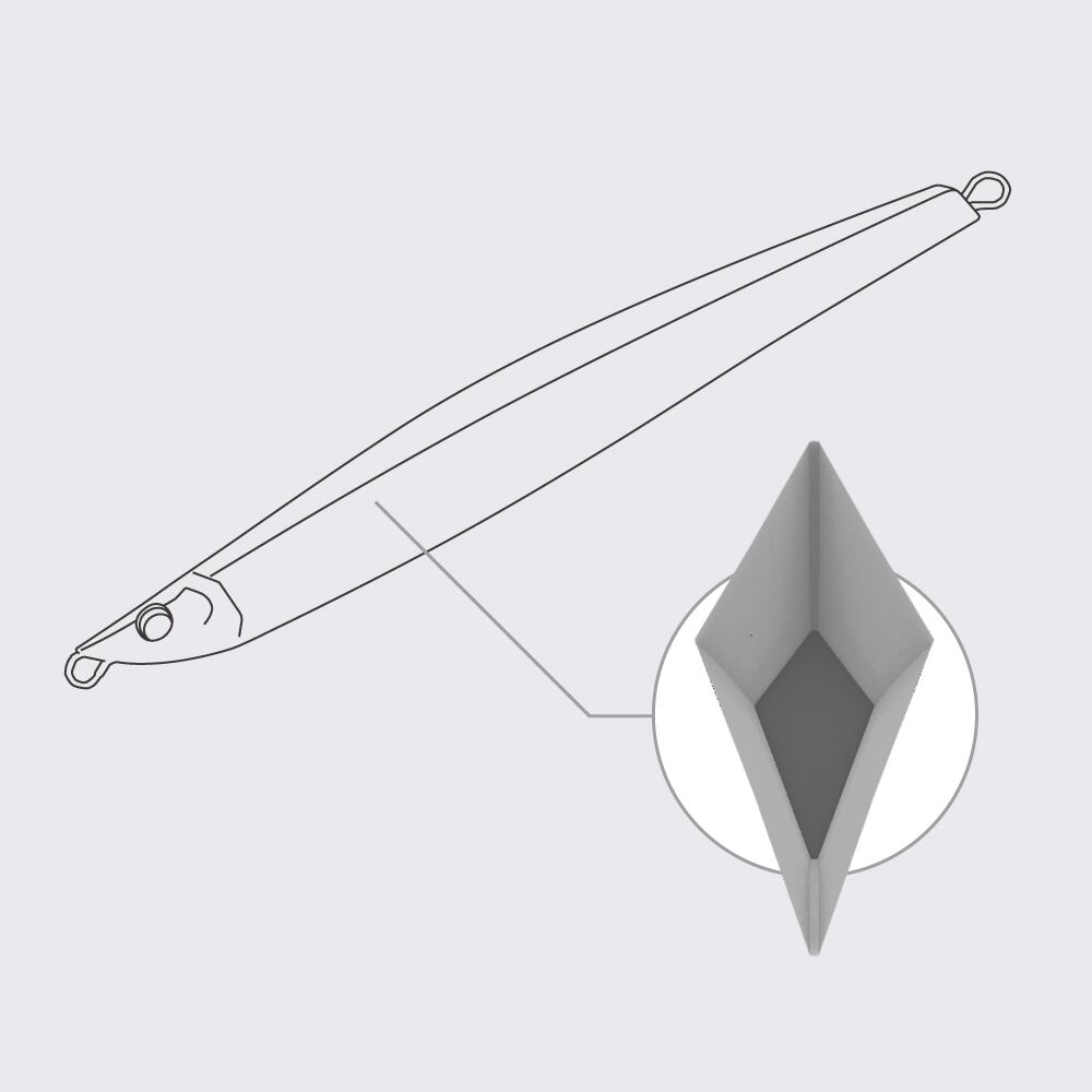 ロンバス(菱形)形状がもたらす強烈なヒラ打ちとスライドフォールが広範囲の魚にアピールし、ターゲットの捕食本能を呼び覚ます。