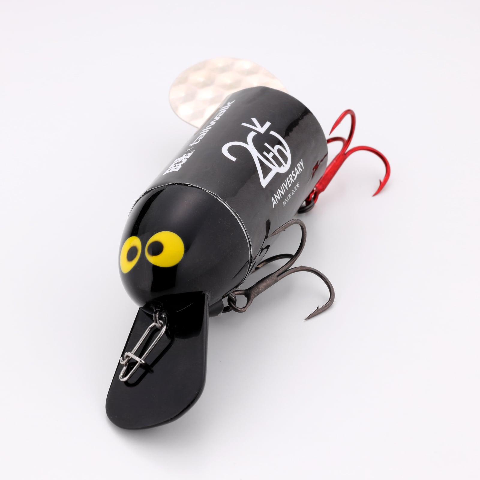 アイの位置、ボディ強度アップ、糸絡みのしにくさ、六角形の特殊加工を施した特注のUSA 製ブレード、DECOY 製リアフック#3の赤バリ、リアフックの接続にはバラシ軽減のための高強度スイベルを装着。